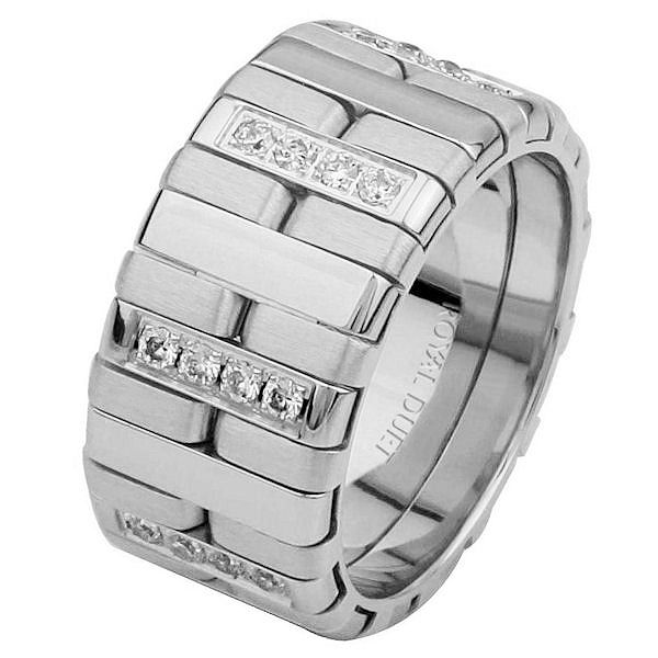 14 kt white gold, comfort fit, 10.25 mm wide, diamond wedding ring. The band has a unique design using white gold and diamonds set in the ring. It has approximately 0.34 ct tw brilliant round cut diamonds, that are VS1-2 in clarity and G-H in color.