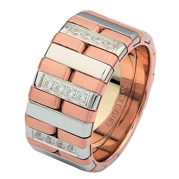 14 kt rose and white gold, comfort fit, 10.25 mm wide, diamond wedding ring. This band uniquely combines white and rose gold together to create a beautiful design with diamonds set in the ring. It has approximately 0.34 ct tw round brilliant cut diamonds, that are VS1-2 in clarity and G-H in color. The rose gold has a brush finish and the white gold has a polished finish. Different finishes may be selected or specified.
