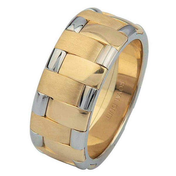 18 kt two-tone gold, comfort fit, 8.25 mm wide, wedding ring. This band uniquely combines white and yellow gold together to create a beautiful design. The yellow gold has a brush finish and the white gold has a polished finish. Different finishes may be selected or specified.