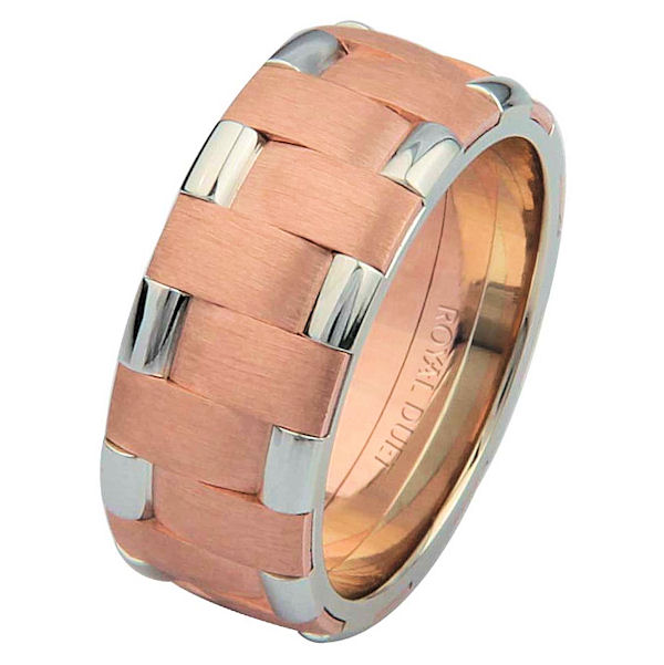 18 kt rose and white gold, comfort fit, 8.25 mm wide, wedding ring. This band uniquely combines the white and rose gold together to create a beautiful design. The rose gold has a brush finish and the white gold has a polished finish. Different finishes may be selected or specified.