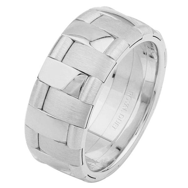 14 kt white gold, comfort fit, 8.25 mm wide, wedding ring. This band uniquely combines the white gold to create a beautiful design. It has a mixture of brushed and polished finishes. Different finishes may be selected or specified.