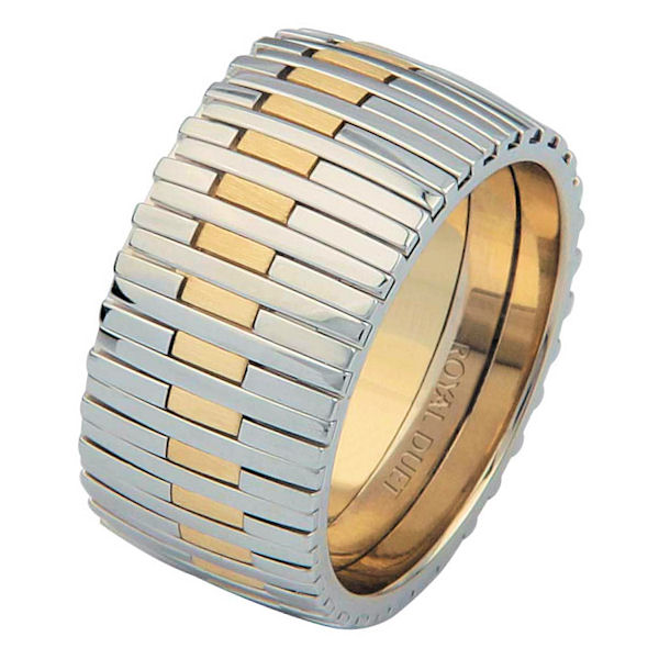 18 kt two-tone gold, comfort fit, 10.4 mm wide, wedding ring. This band combines the white and yellow gold in a unique and different pattern. The yellow gold has a brushed finish and the white gold has a polished finish. Different finishes may be selected or specified.