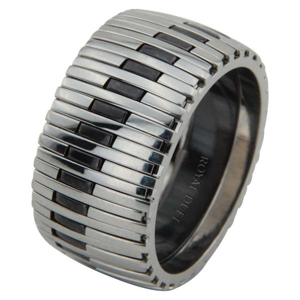 14 kt white gold and black rhodium, comfort fit, 10.4 mm wide, wedding ring. The band combines the white gold with a unique design in the center that has black rhodium to create this beautiful design. Different finishes may be selected or specified.