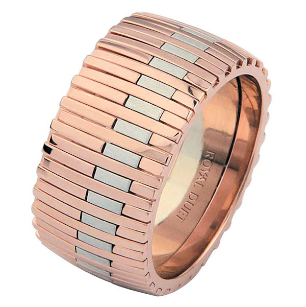 14 kt rose and white gold, comfort fit, 10.4 mm wide, wedding ring. This band combines the white and rose gold in a unique and different pattern. The white gold has a brushed finish and rose gold has a polished finish. Different finishes may be selected or specified.