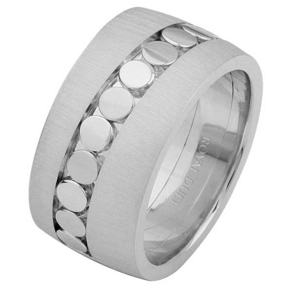 14 kt white gold, comfort fit, 10.25 mm wide, wedding ring. The band uses the white gold in a unique way to create a beautiful pattern. The ring has a mix of brushed and polished finishes. Different finishes may be selected or specified.