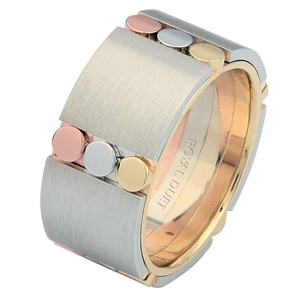 14 kt tri-color gold, comfort fit, 9.3 mm wide, wedding ring. The tri-color wedding band combines white, yellow and rose gold in a unique way to create a beautiful design. It has a mixture of brushed and polished finishes. Different finishes may be selected or specified.