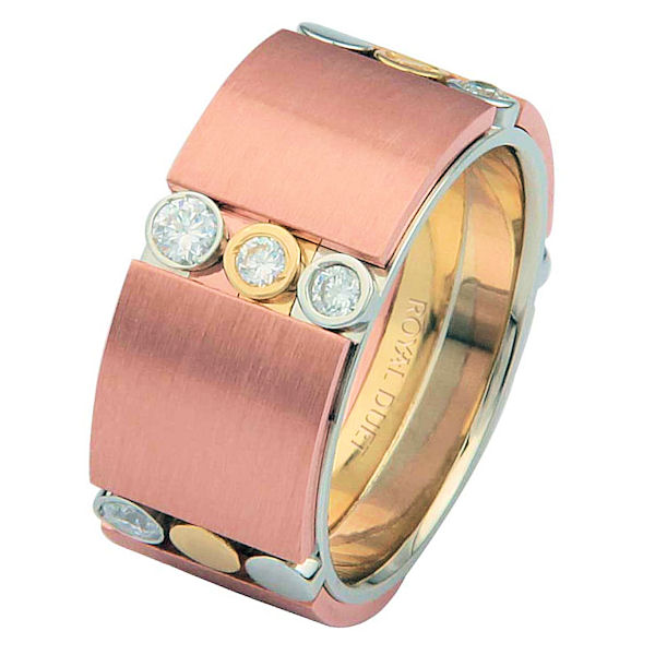 14 kt tri-color gold, comfort fit, 9.3 mm wide, diamond wedding ring. The tri-color wedding band combines white, yellow and rose gold in a unique way to create a beautiful design with diamonds set into the ring. It has approximately 0.42 ct tw round brilliant cut diamonds, that are VS1-2 in clarity and G-H in color. The ring has a mixture of brushed and polished finishes.