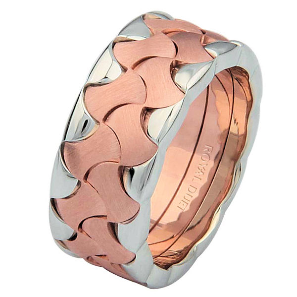 14 kt rose and white gold, comfort fit, 8.9 mm wide, wedding ring. The band combines white and rose gold together to create a beautiful design. It has a mixture of brushed and polished finishes. Different finishes may be selected or specified.
