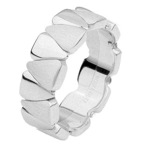 18 kt white gold, comfort fit, 8.0 mm wide, wedding ring. The band combines tear drop shape white gold pieces together to create a beautiful design. Half of the ring has a brushed finish and the other half has a polished finish. Other finishes may be selected or specified.
