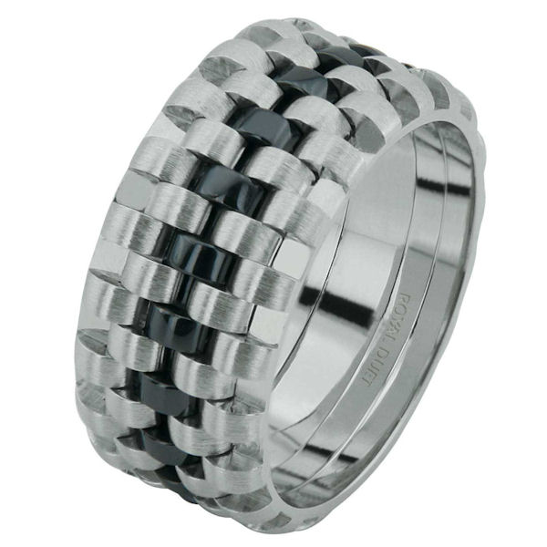 14 kt white gold, comfort fit, 9.25 mm wide, wedding ring. The band has a beautiful pattern with black rhodium in the center. There is a mixture of brushed and polished finishes. Other finishes may be selected or specified.