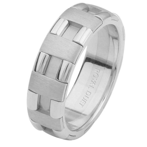 18 kt white gold, comfort fit, 6.0 mm wide, wedding ring. The white gold is put together to create a beautiful design. There is a mixture of brushed and polished finishes. Other finishes may be selected or specified.
