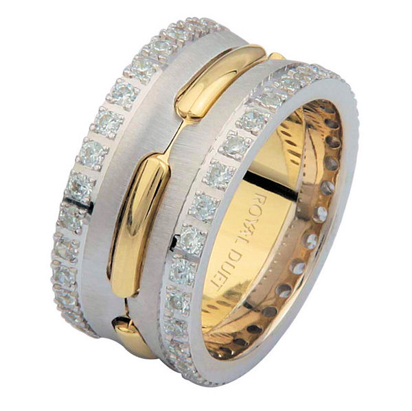 18 kt two-tone gold, comfort fit, 10.2 mm wide, diamond eternity wedding ring. The band has a beautiful mixture of white and yellow gold. There are diamonds set around the whole band on each side. It has approximately 1.05 ct tw round brilliant cut diamonds, that are VS1-2 in clarity and G-H in color. The total weight of the diamonds may vary depending on the size of the ring.