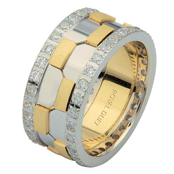 14 kt two-tone gold, comfort fit, 9.3 mm wide, diamond eternity wedding ring. The band has a beautiful design with white and yellow gold. There are diamonds set around the whole band on each side. It has approximately 1.05 ct tw round brilliant cut diamonds, that are VS1-2 in clarity and G-H in color. The total weight of diamonds may vary depending on the size of the ring.