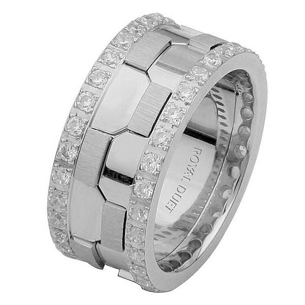 14 kt white gold, comfort fit, 9.3 mm wide, diamond eternity wedding ring. The band has a beautiful design of white gold. There are diamonds around the whole ring set on each side. It has approximately 1.05 ct tw round brilliant cut diamonds, that are VS1-2 in clarity and G-H in color. The total weight of the diamonds may vary depending on the size of the ring.