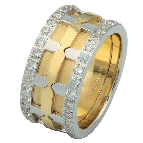18 kt two-tone gold, comfort fit, 10.25 mm wide, diamond eternity ring. The band has a beautiful design with yellow and white gold. The diamonds are set around the whole band. It has approximately 1.05 ct tw round brilliant cut diamonds, that are VS1-2 in clarity and G-H in color. The diamond total weight may vary depending on the size of the ring.