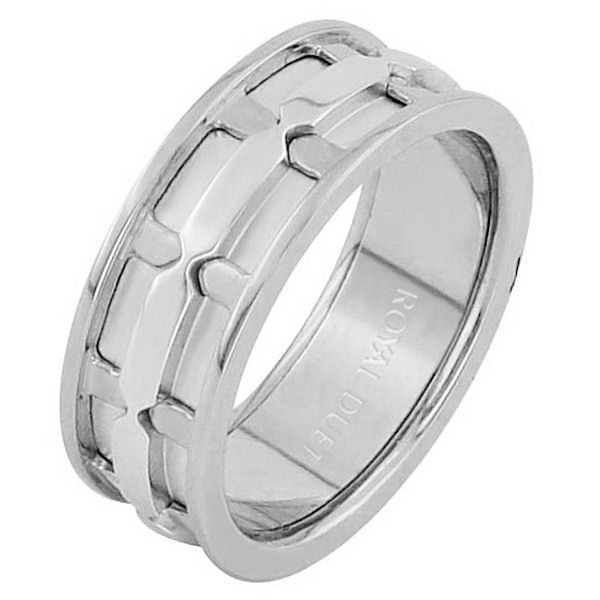 14 kt white gold, comfort fit, 8.1 mm wide, wedding ring. The band has a beautiful design made up of white gold. There is a mix of brushed and polished finishes. Other finishes may be selected or specified.
