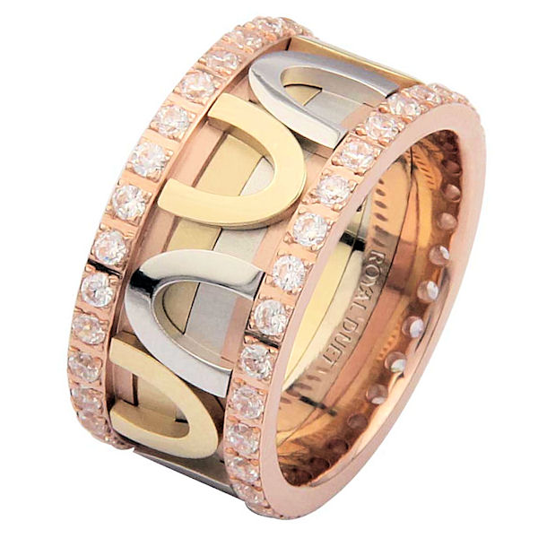 18 kt tri-color gold, comfort fit, 10.25 mm wide, diamond eternity ring. The band has a beautiful mix of white, yellow, and rose gold. The diamonds are set around the whole ring. It has approximately 1.05 ct tw round brilliant cut diamonds, that are VS1-2 in clarity and G-H in color. The diamond total weight may vary slightly depending on the size of the ring.