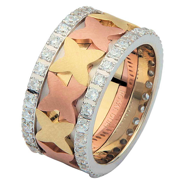 18 kt tri-color gold, comfort fit, 10.25 mm wide, diamond eternity ring. The band has a beautiful design with white, yellow, and rose gold. The diamonds are set around the whole ring. It has approximately 1.05 ct tw round brilliant cut diamonds, that are VS1-2 in clarity and G-H in color. Diamond total weight may vary depending on the size of the ring.