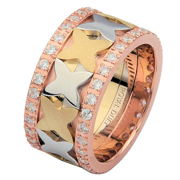14 kt tri-color gold, comfort fit, 10.25 mm wide, diamond eternity ring. The band has a beautiful design with white, yellow, and rose gold. The diamonds are set around the whole ring. It has approximately 1.05 ct tw round brilliant cut diamonds, that are VS1-2 in clarity and G-H in color. Diamond total weight may vary depending on the size of the ring.