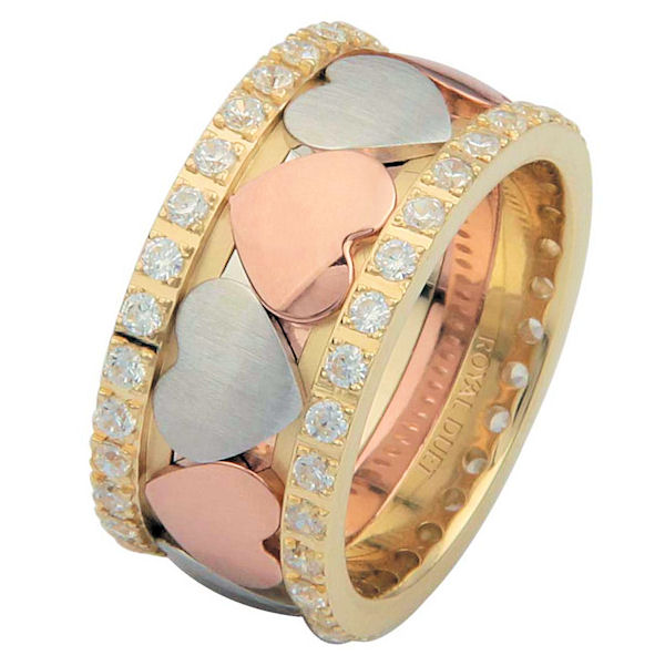14 kt tri-color gold, comfort fit, 10.2 mm wide, diamond eternity ring. The band has a mix of white, rose and yellow gold. There are heart shapes in the center made from rose and white gold. On each side of the ring are diamonds that go around the ring. It has approximately 1.05 ct tw round brilliant cut diamonds, that are VS1-2 in clarity and G-H in color. Diamond total weight may vary depending on the size of the ring.