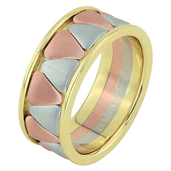 14 kt tri-color, comfort fit, 9.15 mm wide, wedding ring. The band is made of white, yellow, and rose gold. The center of the ring has rounded triangles with a mixture of rose and white gold. Center is brushed and the edges are polished. Other finishes may be selected or specified.