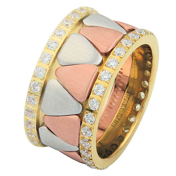 18 kt tri-color, comfort fit, 11.1 mm wide, diamond eternity ring. The band is made beautifully with white, rose and yellow gold. The shapes in the center are rounded triangles. The diamonds accenting each side complete the diamond eternity look. It has approximately 1.05 ct tw round brilliant cut diamonds, that are VS1-2 in clarity and G-H in color. Diamond total weight may vary depending on the size of the ring.