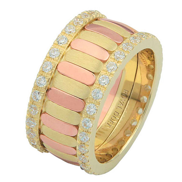 14 kt rose and yellow gold, comfort fit, 10.2 mm wide, diamond eternity ring. The band is made with yellow and rose gold with diamonds accenting each side of the ring. It has approximately 1.05 ct tw round brilliant cut diamonds, that are VS1-2 in clarity and G-H in color. Diamond total weight may vary depending on the size of the ring.