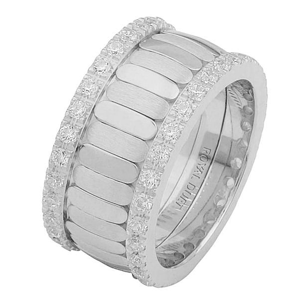 14 kt white gold, comfort fit, 10.2 mm wide, diamond eternity ring. The band is made of white gold with diamonds accenting each side of the ring. It has approximately 1.05 ct tw round brilliant cut diamonds, that are VS1-2 in clarity and G-H in color. Diamond total weight may vary depending on the size of the ring.
