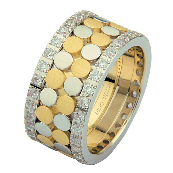 14 kt two-tone gold, comfort fit, 10.35 mm wide, diamond eternity ring. The band has a beautiful composition of white and yellow gold with diamonds accenting each side of the ring. It has approximately 1.05 ct tw round brilliant cut diamonds, that are VS1-2 in clarity and G-H in color. Diamond total weight may vary depending on the size of the ring.