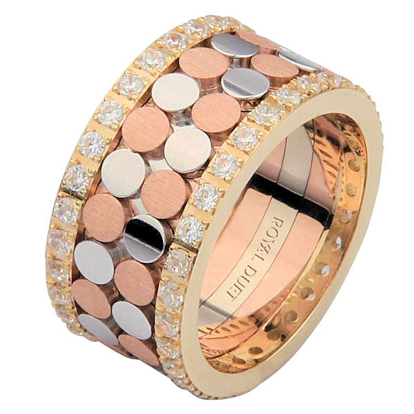 14 kt tri-color gold, comfort fit, 10.35 mm wide, diamond eternity ring. The band has a beautiful composition of rose, white, and yellow gold with diamonds accenting each side of the ring. It has approximately 1.05 ct tw round brilliant cut diamonds, that are VS1-2 in clarity and G-H in color. Diamond total weight may vary depending on the size of the ring.