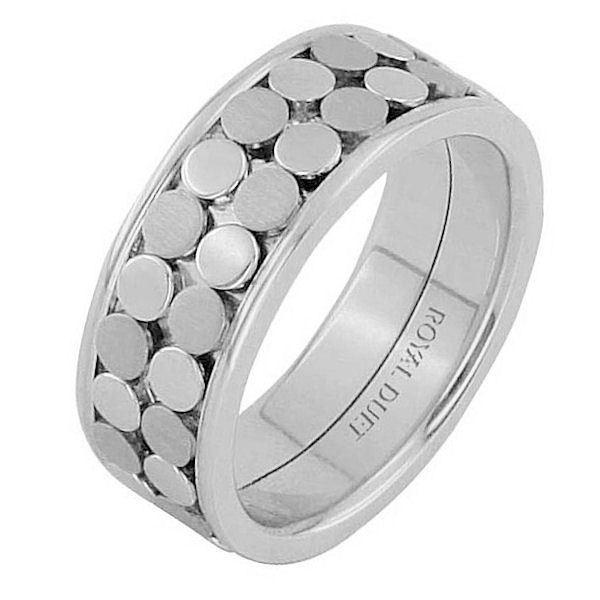 14 kt white gold, comfort fit, 8.35 mm wide, wedding ring. The band has a beautiful design made with white gold. There is a mix of brushed and polished finish. Other finishes may be selected or specified.