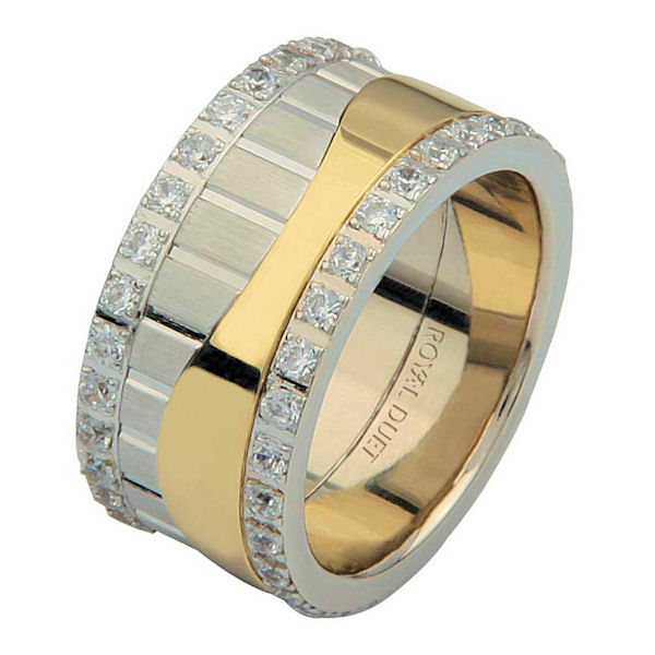18 kt two-tone gold, comfort fit, 10.2 mm wide, diamond eternity ring. The band has a beautiful composition of white and yellow gold with diamonds accenting each side fo the ring. It has about 1.05 ct two round brilliant cut diamonds, that are VS1-2 in clarity and G-H in color. Diamond total weight may vary depending on the size of the ring.