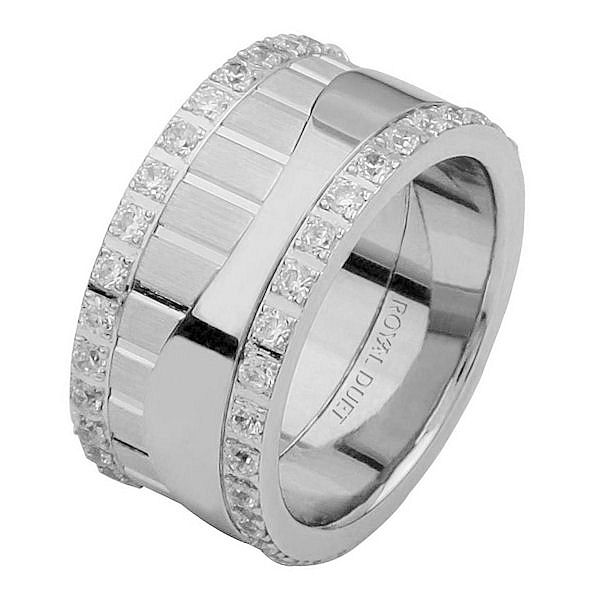 14 kt white gold, comfort fit, 10.2 mm wide, diamond eternity ring. The band has beautiful design made with white gold and diamonds accenting each side of the ring. It has about 1.05 ct tw round brilliant cut diamonds, that are VS1-2 in clarity and G-H in color. Diamond total weight may vary depending on the size of the ring.