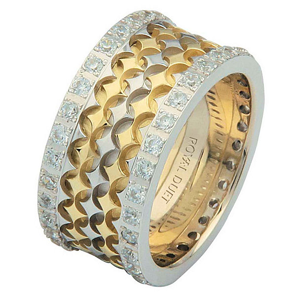 18 kt two-tone gold, comfort fit, 10.0 mm wide, diamond eternity ring. The band has a beautiful composition of white and yellow gold with diamond accenting each side of the band. It has about 1.05 ct tw round brilliant cut diamonds, that are VS1-2 in clarity and G-H in color. The total diamond weight may vary depending on the size of the ring.