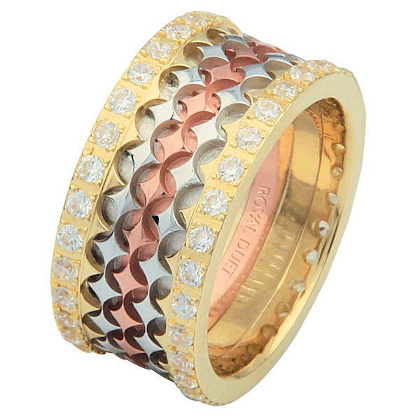 18 kt tri-color gold, comfort fit, 10.0 mm wide, diamond eternity ring. The band has a beautiful composition of rose, yellow, and white gold with diamonds accenting each side of the ring. It has about 1.05 ct tw round brilliant cut diamonds, that are VS1-2 in clarity and G-H in color. Diamond total weight may vary depending on the size of the ring.