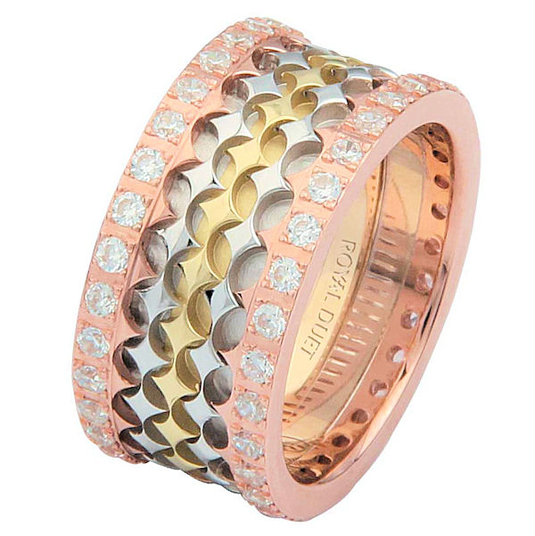 14 kt tri-color gold, comfort fit, 10.0 mm wide, diamond eternity ring. The band has a beautiful composition of rose, yellow, and white gold with diamond accenting the ring on each side. It has about 1.05 ct tw round brilliant cut diamonds, that are VS1-2 in clarity and G-H in color. The diamond total weight may vary depending on the size of the ring.