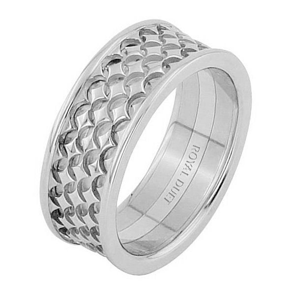 14 kt white gold, comfort fit, 8.35 mm wide, wedding ring. The band has a unique design made from white gold. Different finishes may be selected or specified.