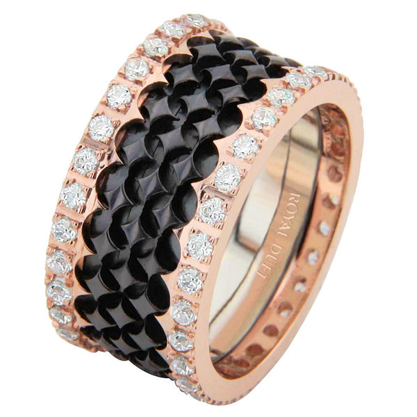 18 kt rose gold and black rhodium, comfort fit, 10.0 mm wide, diamond eternity ring. The band has a beautiful composition of rose gold and black rhodium with diamonds accenting each side of the ring. It has about 1.05 ct tw round brilliant cut diamonds, that are VS1-2 in clarity and G-H in color. Diamond total weight may vary depending on the size of the ring.