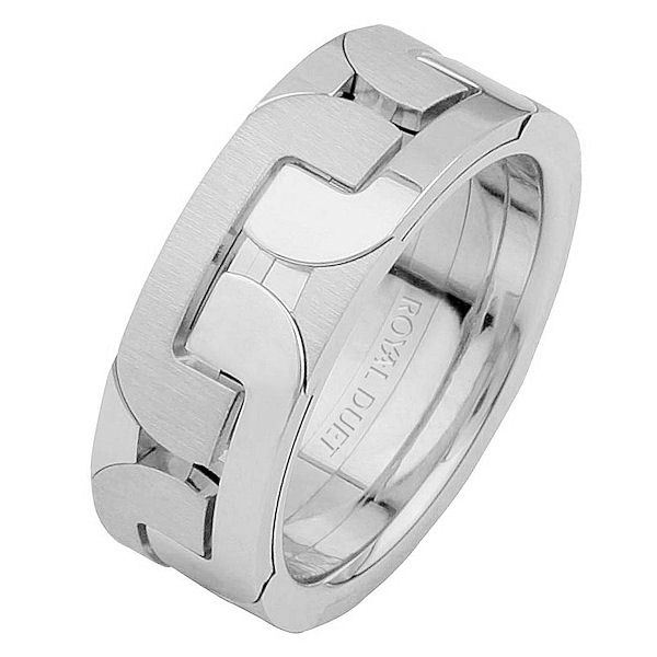 14 kt white gold, comfort fit, 7.3 mm wide, wedding ring. The band has a unique design made in white gold. There is a mix of brushed and polished finishes. Other finishes may be selected or specified.