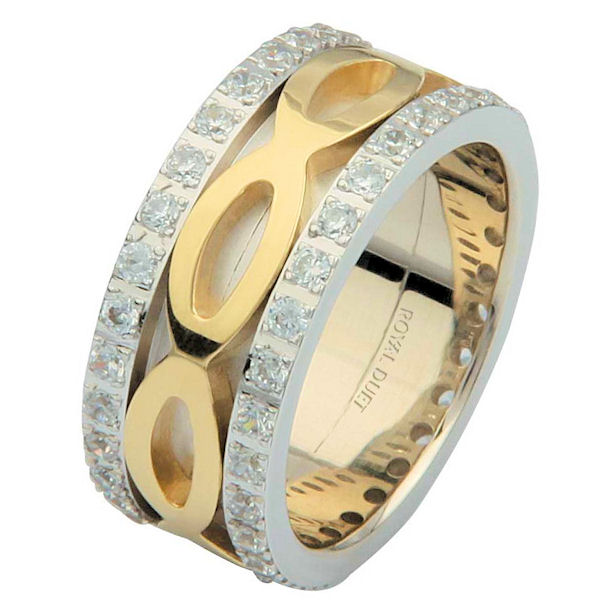 18 kt two-tone gold, comfort fit, 8.75 mm wide, diamond eternity ring. The band has a beautiful composition of white and yellow gold with diamonds accenting each side of the ring. It has about 1.05 ct tw round brilliant cut diamonds, that are VS1-2 in clarity and G-H in color. The diamond total weight may vary depending on the size of the ring.