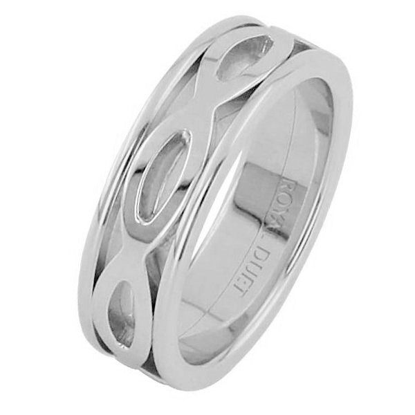 18 kt white gold, comfort fit, 6.6 mm wide, wedding ring. The band has a unique design made with white gold. Different finishes may be selected or specified.