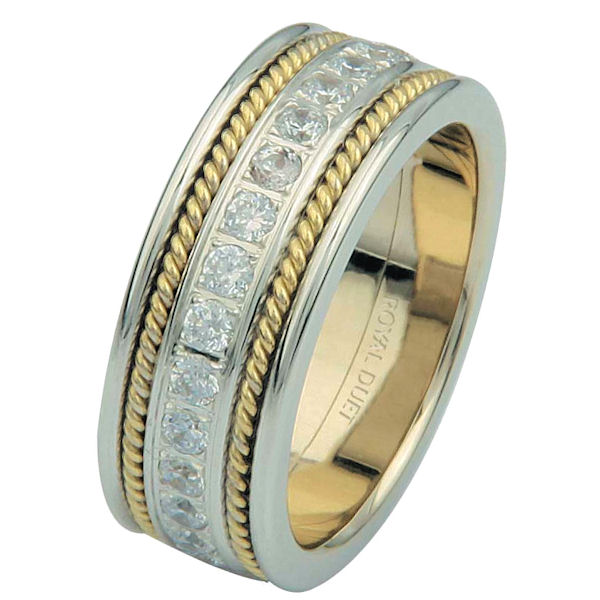 18 kt two-tone gold, comfort fit, 7.65 mm wide, diamond eternity ring. The band has a beautiful combination of white and yellow gold with diamonds set in the center. There are two hand crafted ropes on each side of the ring. The ring has about 1.02 ct tw round brilliant cut diamonds, that are VS1-2 in clarity and G-H in color.