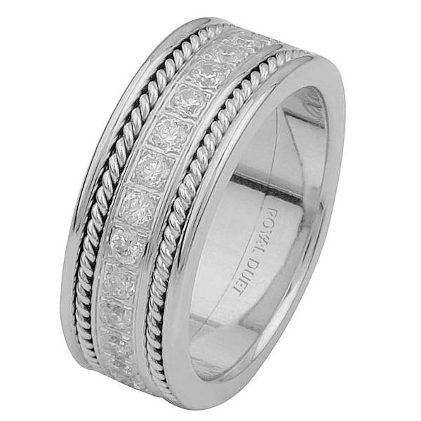 14 kt white gold, comfort fit, 7.65 mm wide, diamond eternity ring. The band has a beautiful hand crafted design made with white gold and diamonds set down the center of the ring. It has about 1.02 ct tw round brilliant cut diamonds, that are VS1-2 in clarity and G-H in color.
