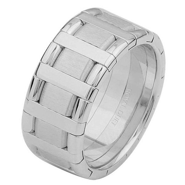 14 kt white gold, comfort fit, 9.15 mm wide, wedding ring. The band has a beautiful design made with white gold. There is a mix of brushed and polished finishes. Other finishes may be selected or specified.