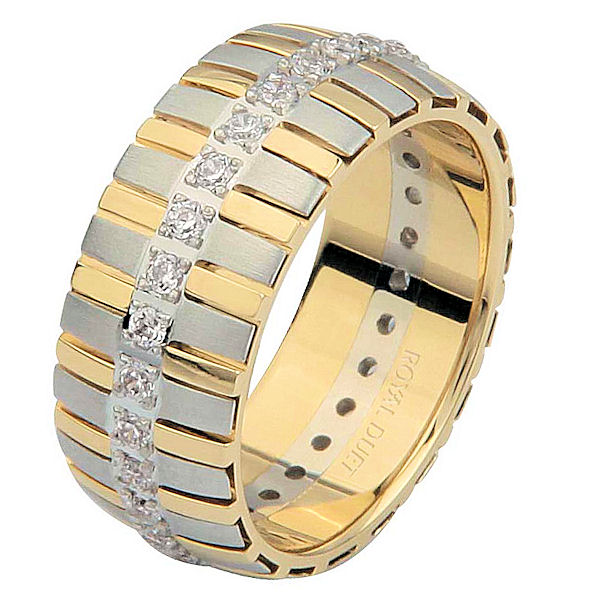 18 kt two-tone gold, comfort fit, 8.20 mm wide, diamond eternity ring. The band has a unique combination of white and yellow gold with diamonds set down the center of the ring. It has about 0.60 ct tw round brilliant cut diamonds, that are VS1-2 in clarity and G-H in color. Diamond total weight may vary depending on the size of the ring.