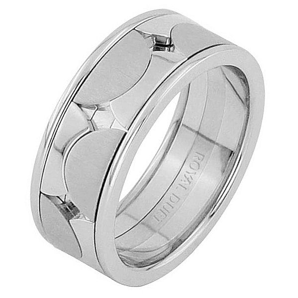 14 kt white gold, comfort fit, 8.3 mm wide, wedding ring. The band has a unique design made with white gold. Different finishes may be selected or specified.