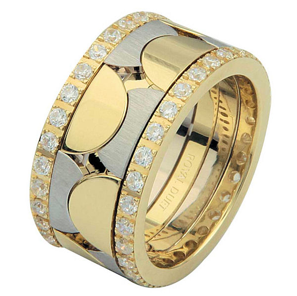 18 kt two-tone gold, 10.25 mm wide, comfort fit, diamond eternity ring. The band has a unique combination of white and yellow gold with diamonds accenting each side of the ring. It has about 1.05 ct tw round brilliant cut diamonds, that are VS1-2 in clarity and G-H in color. The diamond total weight may vary depending on the size of the ring.