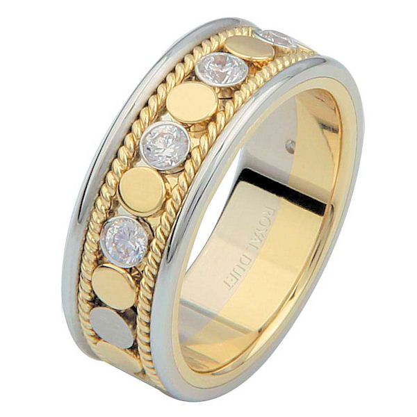 14 kt two-tone gold, 6.9 mm wide, comfort fit, diamond eternity ring. The band has a beautiful combination of white and yellow gold with diamonds set in the center. There are hand crafted ropes in the ring. The ring has about 0.28 ct tw round brilliant cut diamonds, that are VS1-2 in clarity and G-H in color.