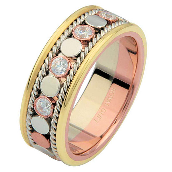 14 kt tri-color gold, 6.9 mm wide, comfort fit, diamond eternity ring. The band has a beautiful combination of white, rose and yellow gold with diamonds set down the center. On the side of the diamonds are hand crafted ropes set into the ring. The ring has about 0.28 ct tw round brilliant cut diamonds, that are VS1-2 in clarity and G-H in color.