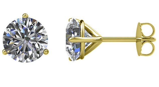 14K gold, 3-prongs, friction back diamond earrings. Diamonds together weigh approximately 2.00ct and are graded as SI in clarity G-H in color.